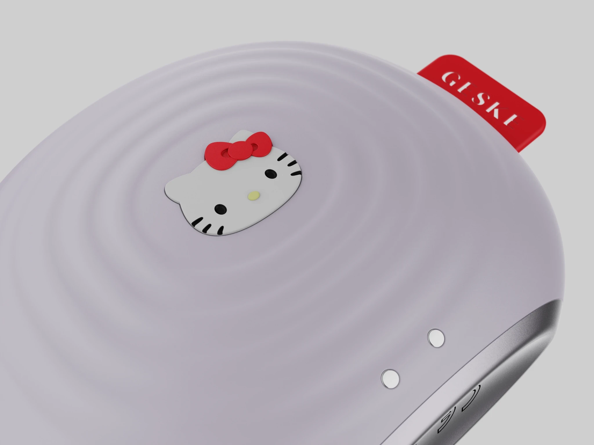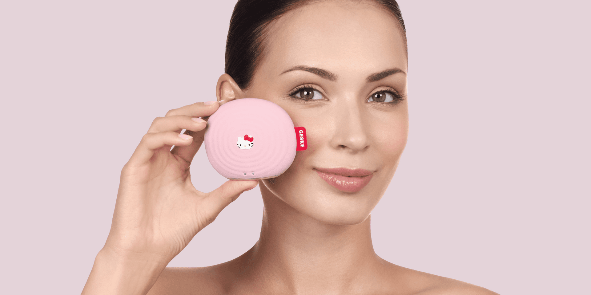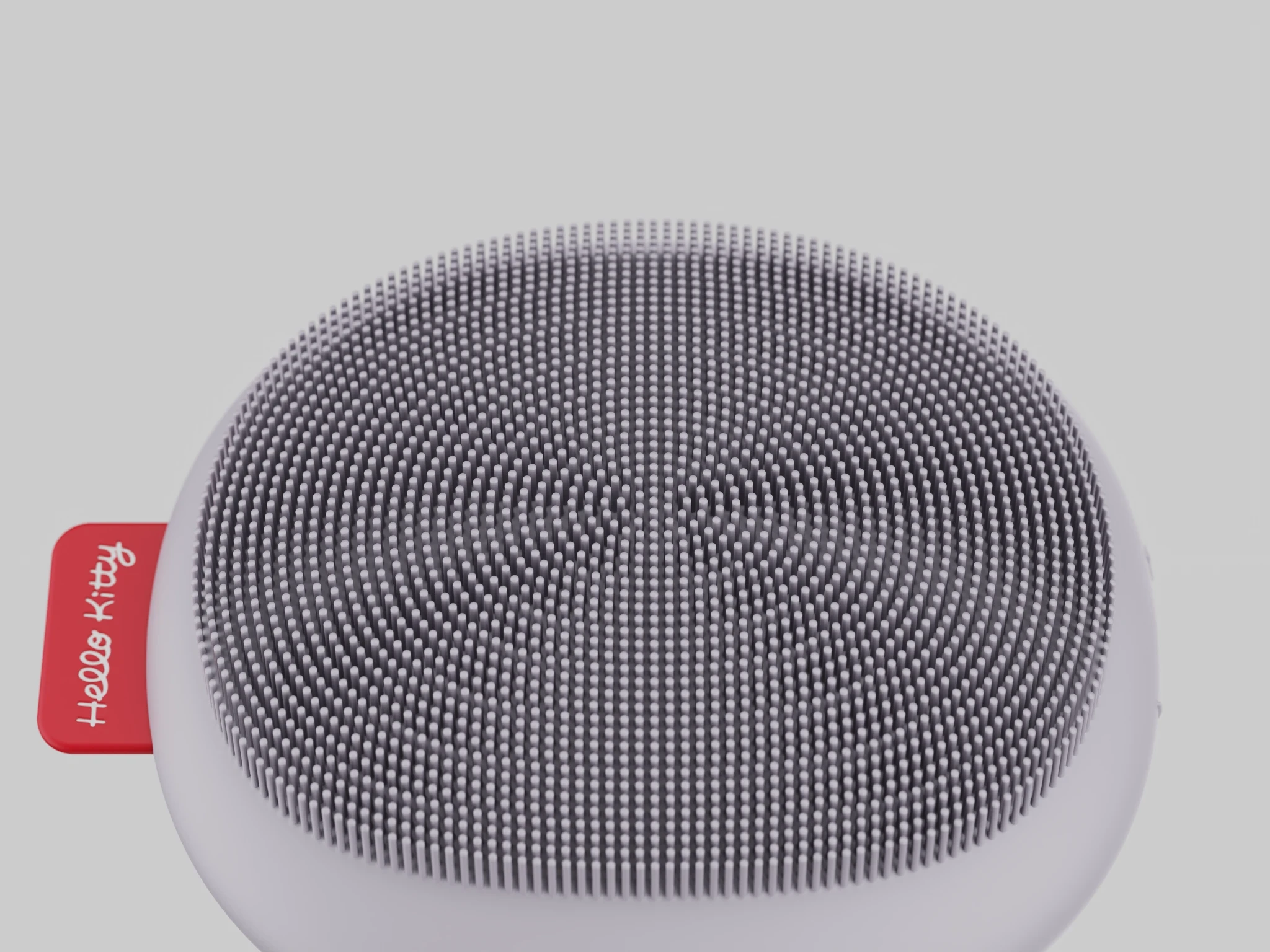Design a compact, dual-function skincare device that integrates cleansing and massaging functions while aligning with Hello Kitty brand identity. Ensure ergonomic comfort and maintain performance standards of the existing facial brush line.